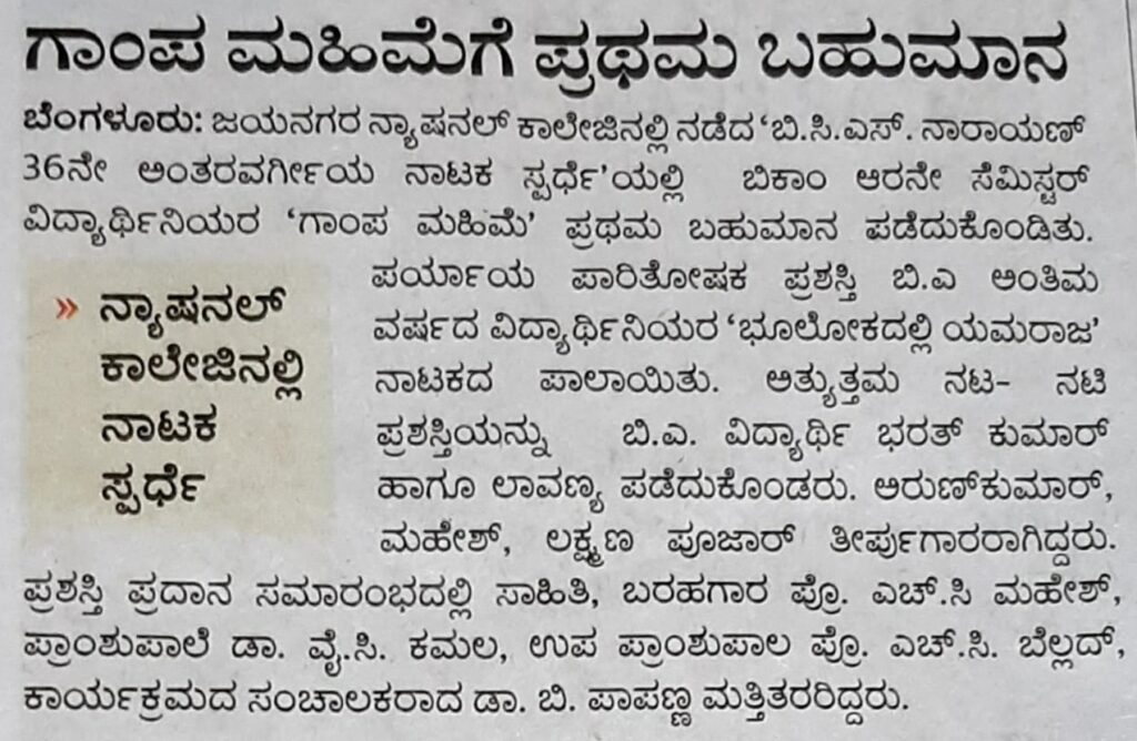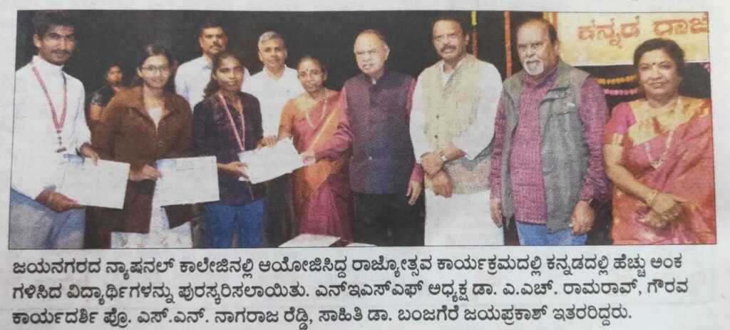 ಜಯನಗರದ ನ್ಯಾಷನಲ್ ಕಾಲೇಜಿನಲ್ಲಿ ಆಯೋಜಿಸಿದ್ದ ರಾಜ್ಯೋತ್ಸವ ಕಾರ್ಯಕ್ರಮದಲ್ಲಿ ಕನ್ನಡದಲ್ಲಿ ಹೆಚ್ಚು ಅಂಕ ಗಳಿಸಿದ ವಿದ್ಯಾರ್ಥಿಗಳನ್ನು ಪುರಸ್ಕರಿಸಲಾಯಿತು