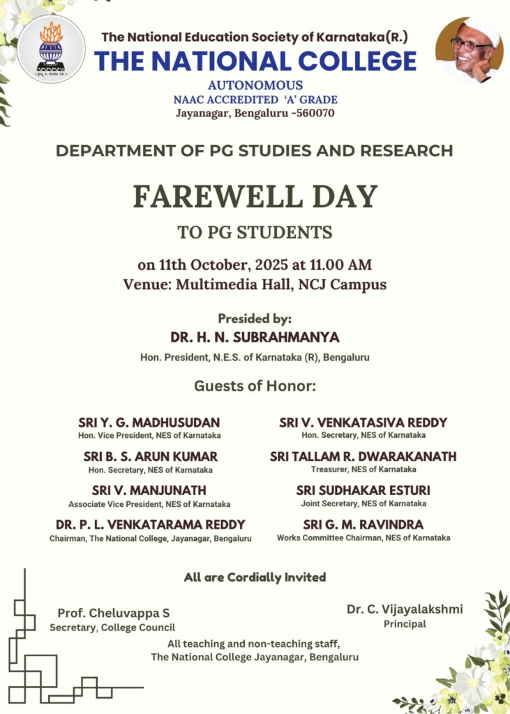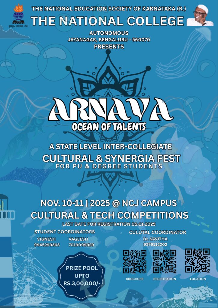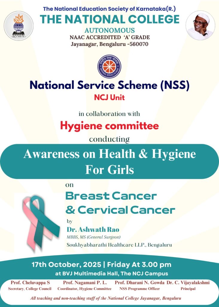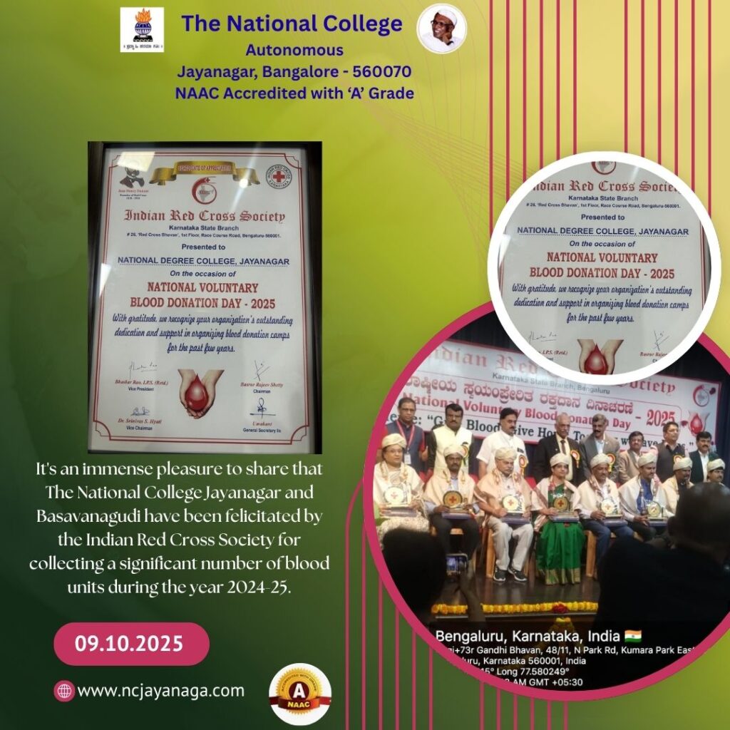 The National College, Jayanagar and Basavanagudi, was felicitated by the Indian Red Cross Society for its outstanding contribution to voluntary blood donation. The felicitation ceremony took place on 09/10/2025, where the college was recognized for collecting a significant number of blood units during the recent blood donation drive organized on campus.
