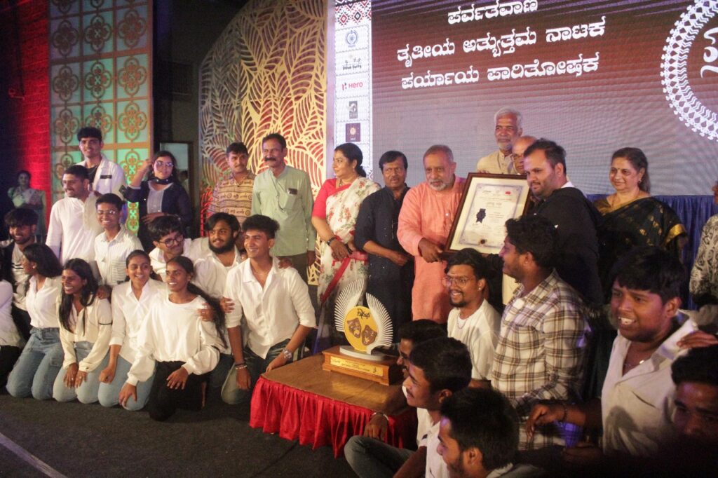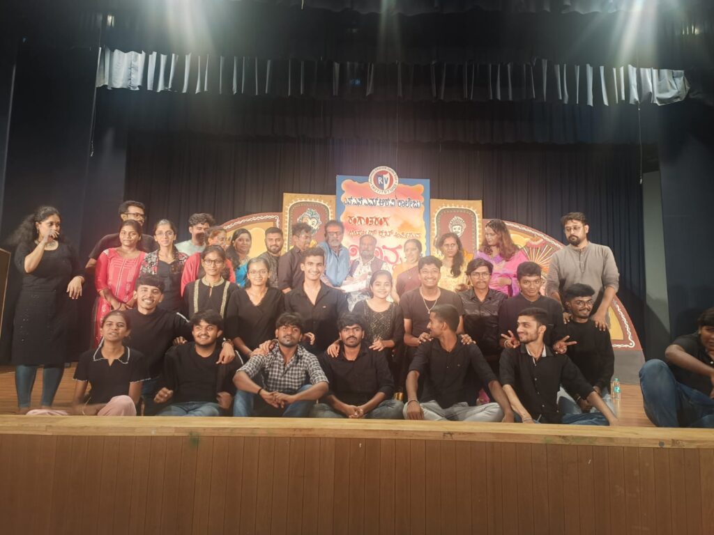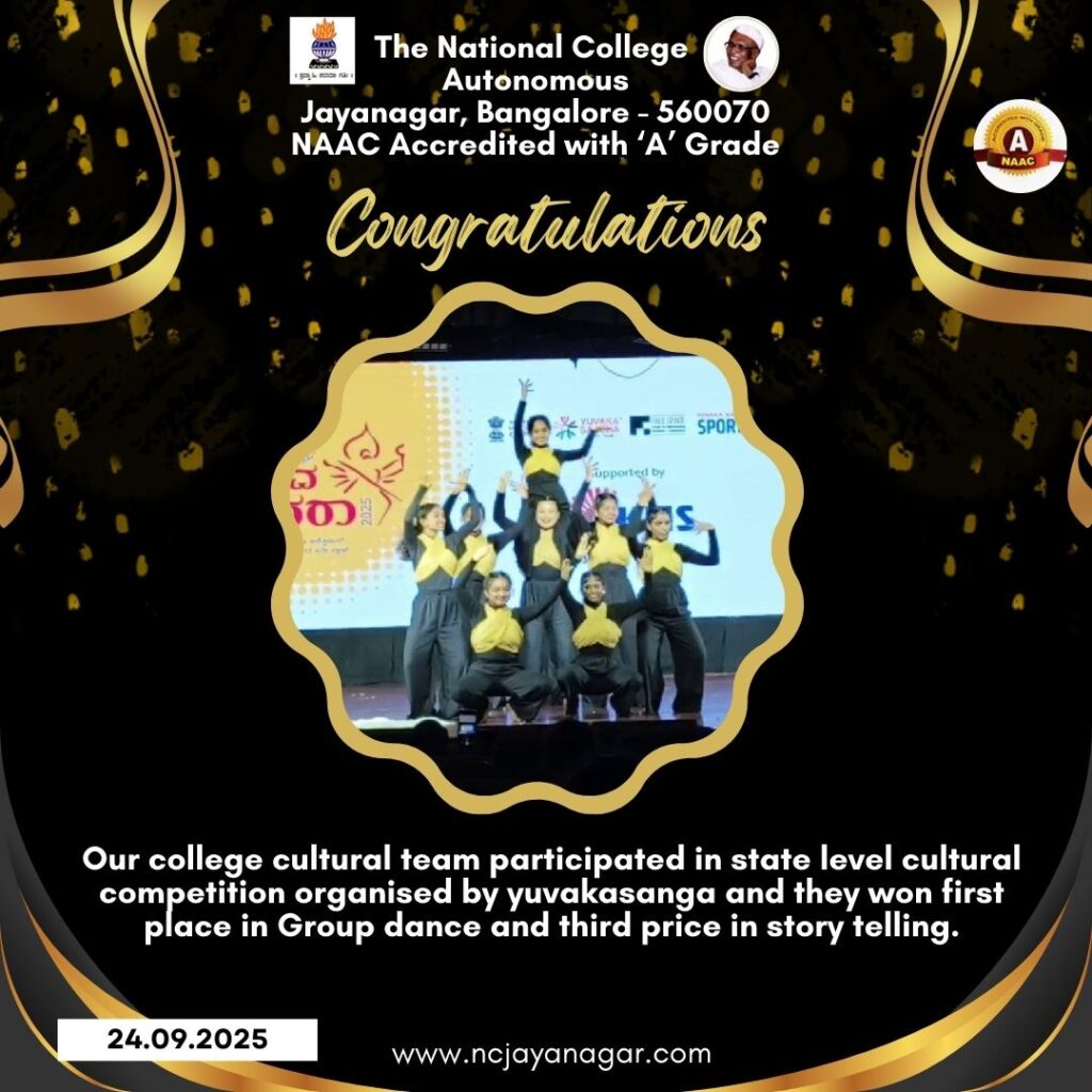 Our National College drama team participated in the Samashthi 2025 college drama competition, held as part of the 25th anniversary celebrations of Samashti Rangam theatre group. We performed the play “Twelfth Night” , translated into Kannada by Prof. Lakshminarayan Bhat from the original work by William Shakespeare. Our team won several awards, including: – Best