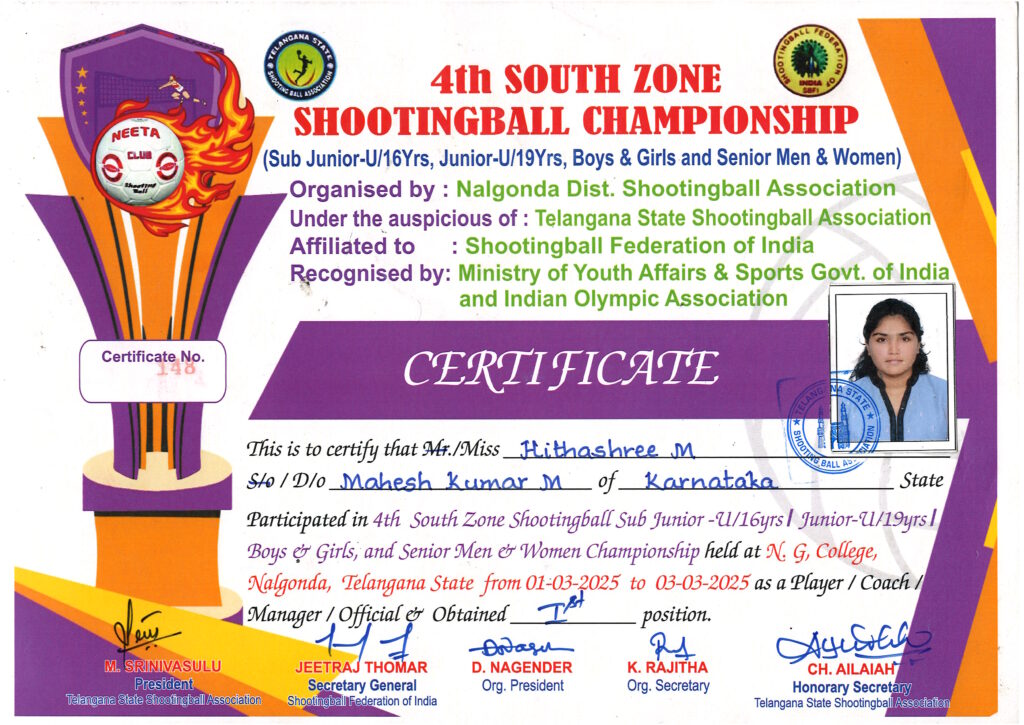 We are incredibly proud to congratulate Kumari. Hithashree M was selected for a state team to take part in the 4th South Zone Shooting Ball Championship, which was held at Nelagonda (Telangana). This is a remarkable achievement and a testament to your hard work, dedication, and talent.