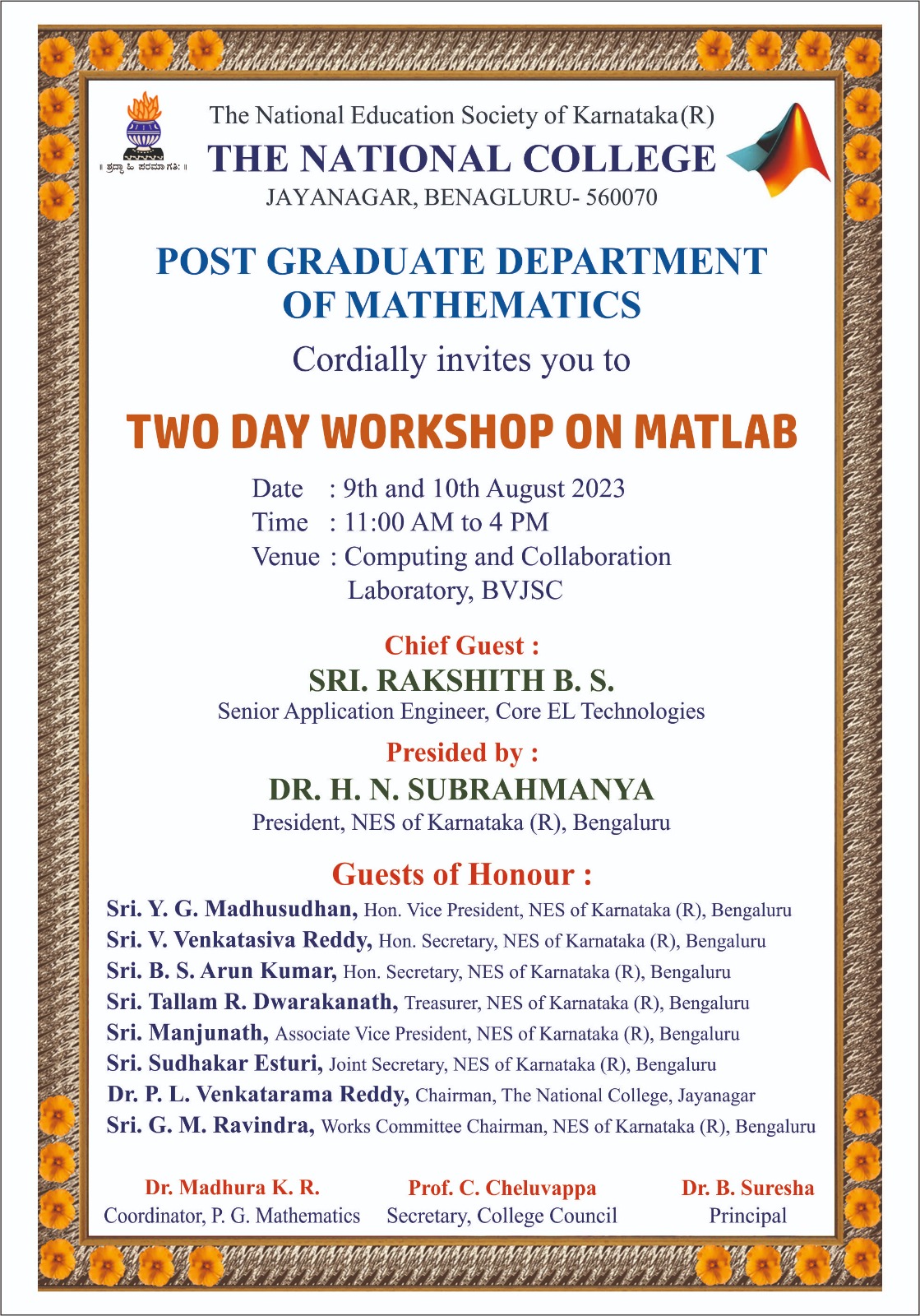 > Dept of PG Mathematics Cordially invites you to Two day Workshop on Matlab