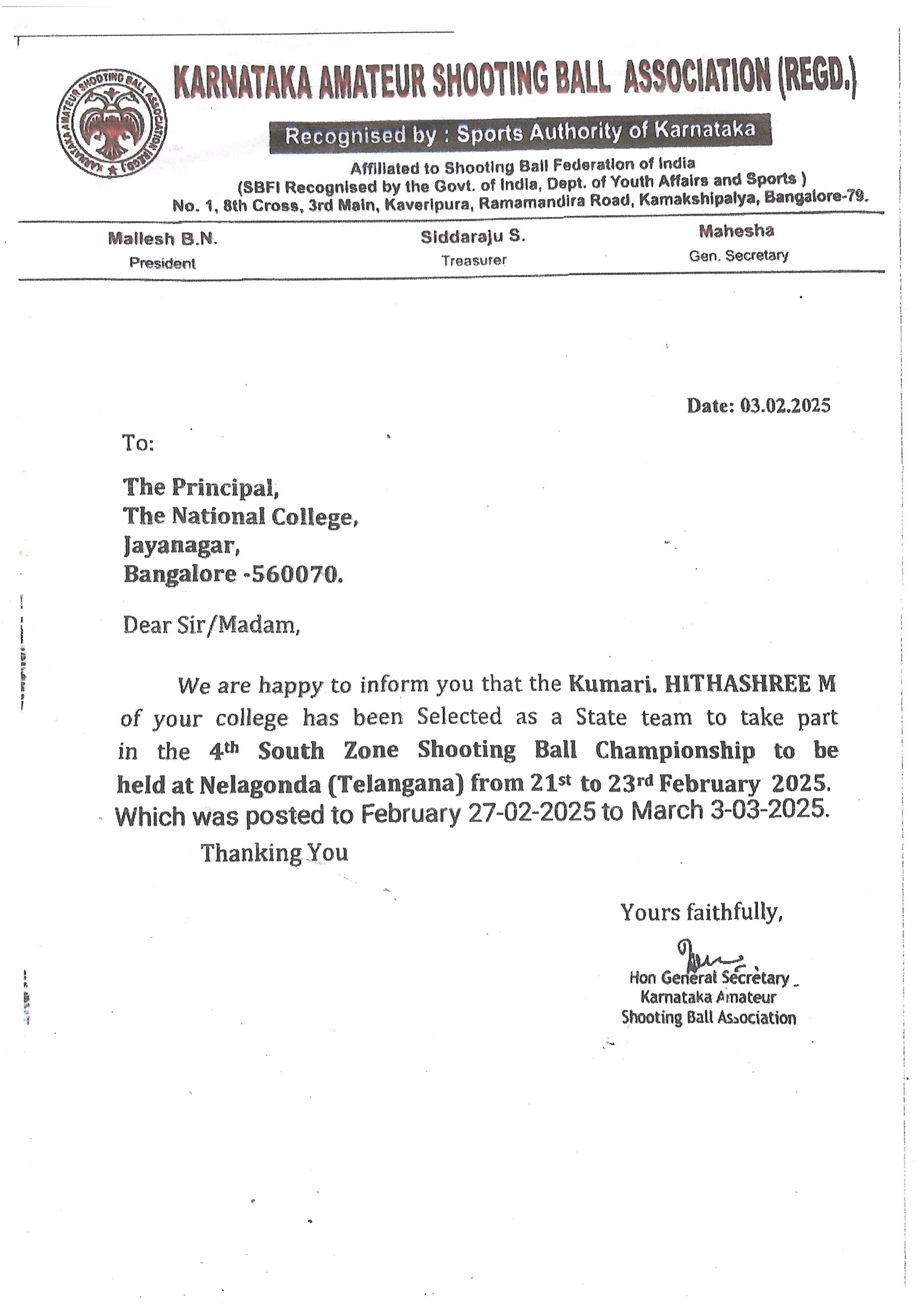 We are incredibly proud to congratulate Kumari. Hithashree M was selected for a state team to take part in the 4th South Zone Shooting Ball Championship, which was held at Nelagonda (Telangana). This is a remarkable achievement and a testament to your hard work, dedication, and talent.